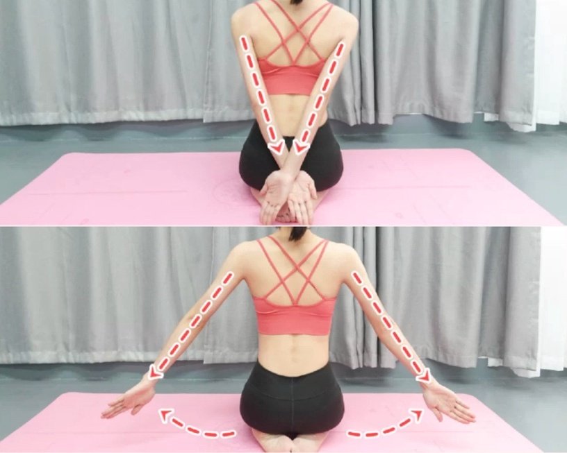 接著以跪姿在地上,手臂向身後交叉,接著再往身體兩側打開,在做這組動作時記得要將背部收緊,可以做慢一點,感受肌肉的拉伸~可以受到手臂後側、下方,還可以訓練背部緊實度!這組動作每天做三組,每一組做30次。