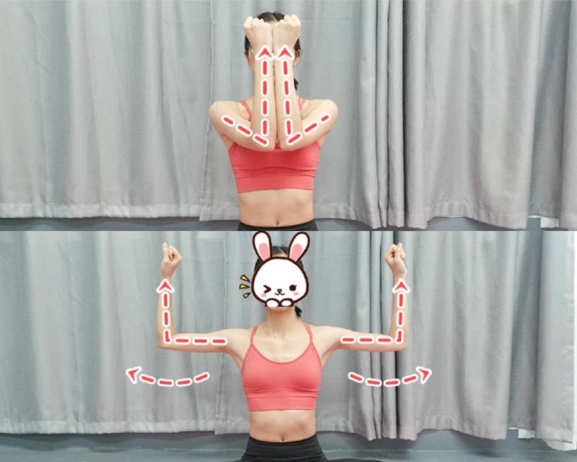首先是最基礎的雙臂開合動作~一開始先將手臂彎曲呈90度,雙手在胸前併攏,接著再向兩側打開。這組運動每組30個,每天做3組。這樣運動雖然看起來很簡單,但是可以幫助訓練到手臂最容易產生蝴蝶袖的下緣!做這個動作的時候記得要抬頭挺胸,不要駝背,效果會更好~