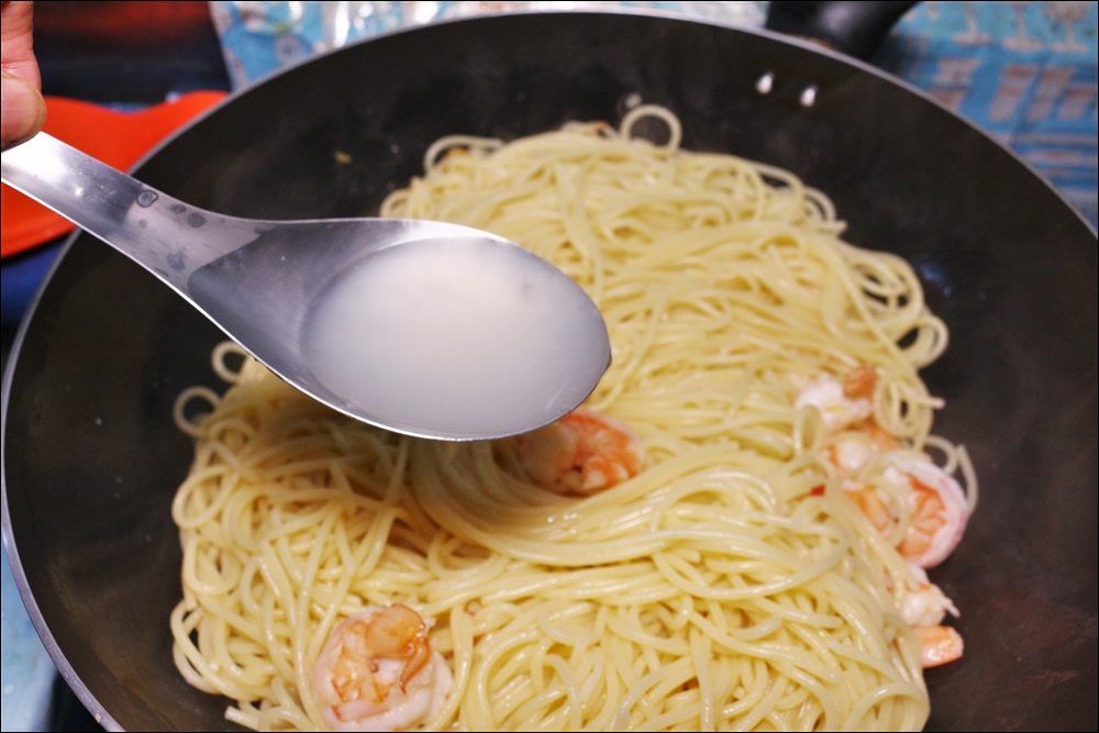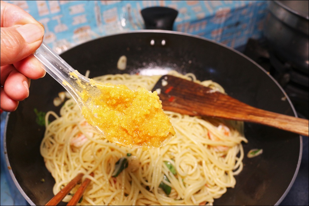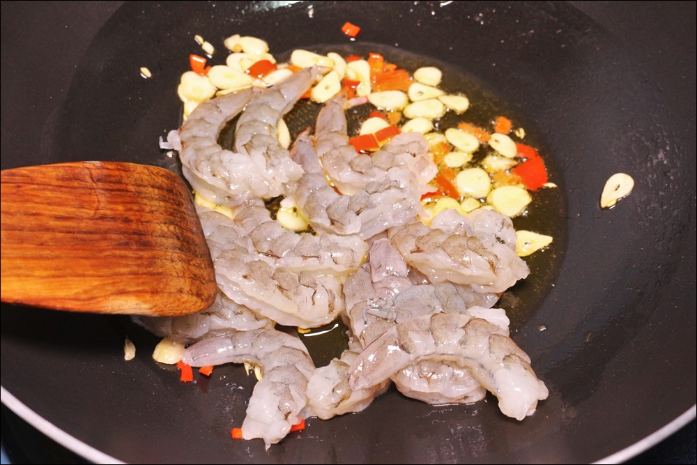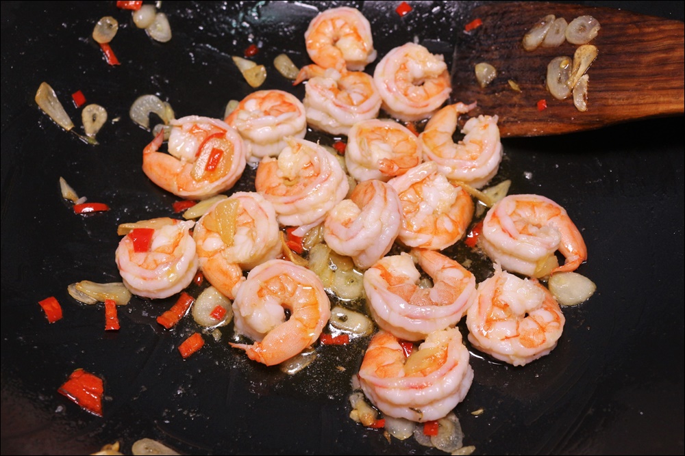 3.等蒜末煸至稍微變色且可以聞到濃濃的蒜香時,再將蝦子入鍋翻炒,而為了不讓蝦子肉質快速變老,可以加入約1大匙的煮麵水。