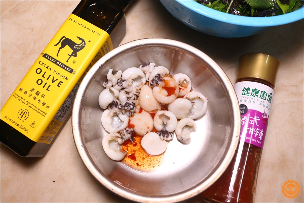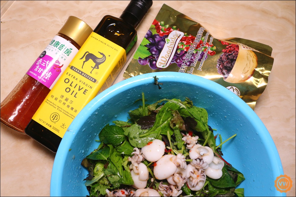 材料:生菜一盒、小章魚適量、泰式甜辣醬適量、橄欖油1—2大匙、綜合果乾適量、橄欖油3大匙