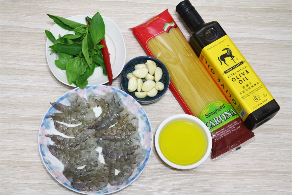 材料:草蝦10尾、義大利麵1包、蒜末4大匙、蒜頭3顆、乾辣椒2根、九層塔或蘿勒10片、橄欖油3大匙
