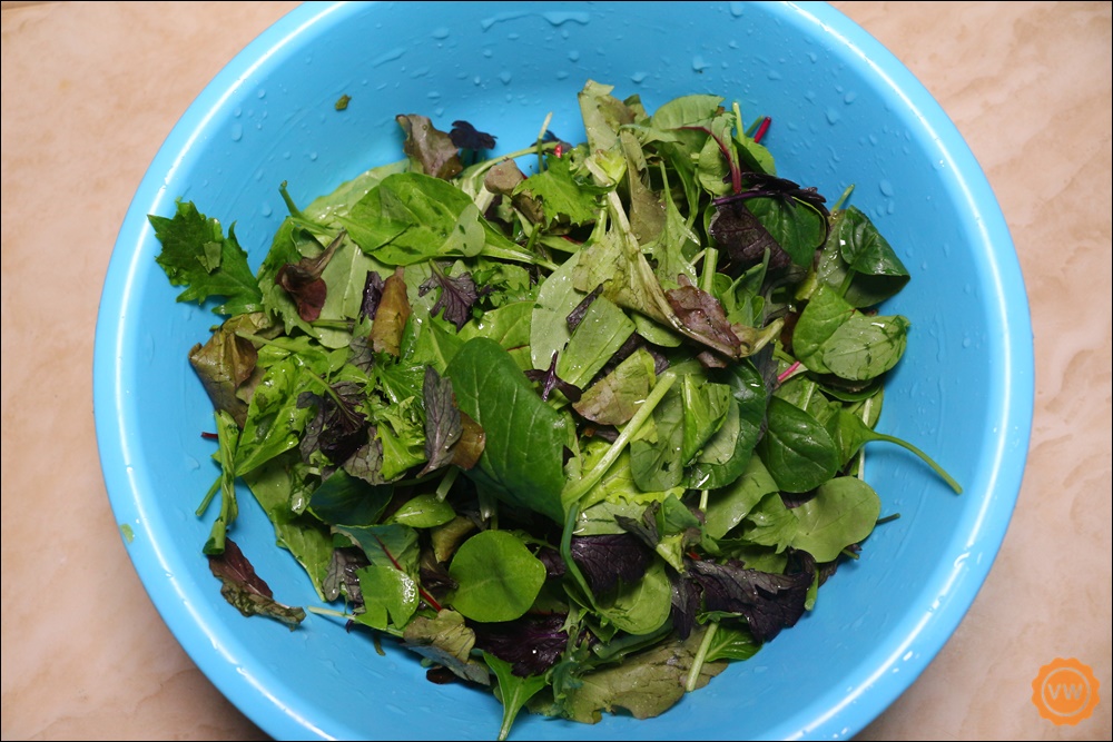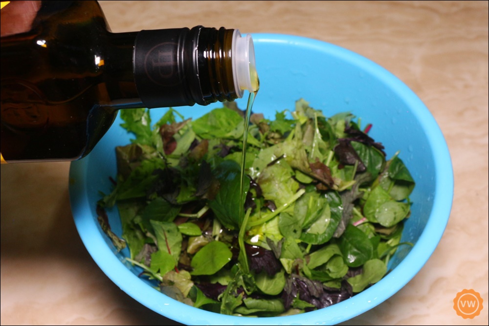 2.將洗淨後瀝乾的生菜倒入橄欖油以輕輕攪拌的方式拌匀