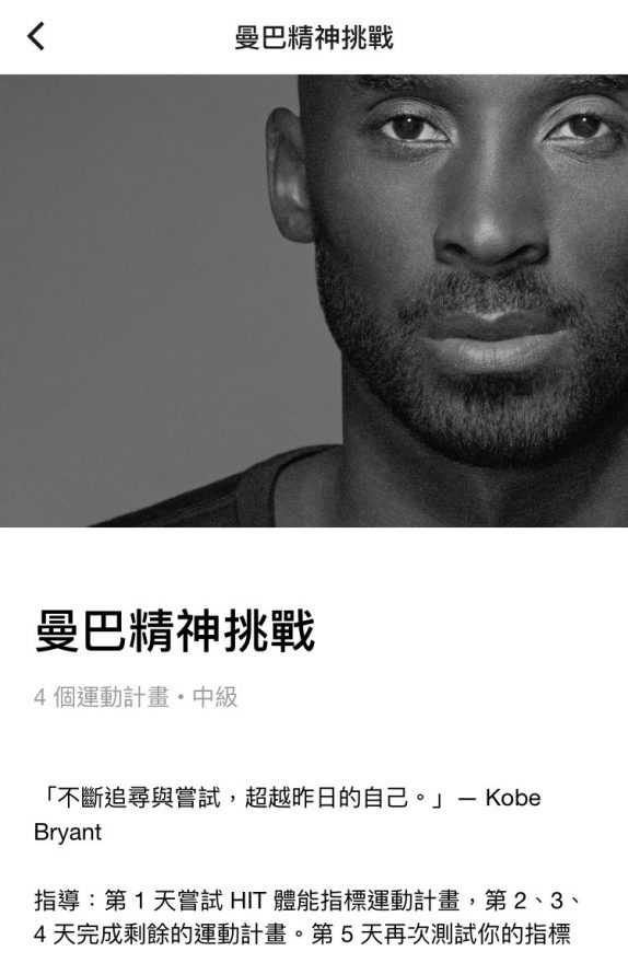 美國時間 8 月 23 日 Kobe Bryant 的 42 歲冥誕這天,Nike 製作的影片《Better》當中 Kendrick Lamar 以這麼一句話開場,接著以一連串 Better 道出所謂的 Mamba Mentality 曼巴精神正是如此,每一天都要比過去的自己更好。曼巴週期間臺灣 Nike 除了規劃女生友善球場、專訓練活動以及相關紀念產品發售之外,也要透過 NTC、NRC App 向大家發起挑戰,屬於曼巴精神的訓練菜單邀你一起實踐。