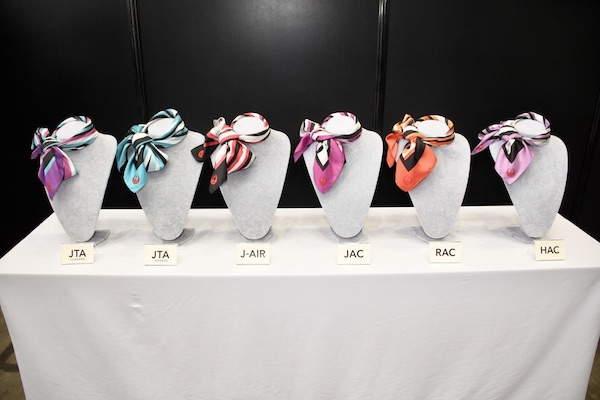 一如現行做法,日航各社的圍巾用色是不同的。