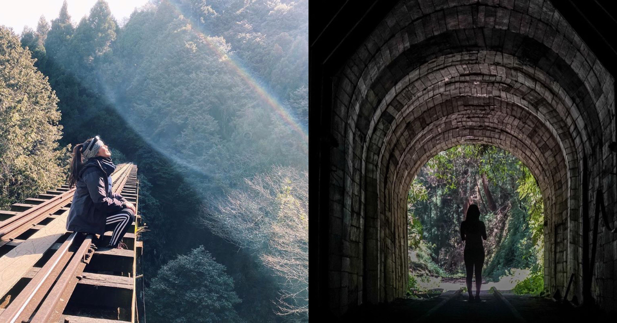 老舊的木造鐵道與橋樑、崩塌的山壁與隧道,「眠月線」隱身在濃密的山林之間,一走進隧道彷彿穿越了時空,滿滿的廢墟感讓人分不清楚虛、實。森林中的安靜充滿了靈性與能量,讓人想到宮崎駿的《魔法公主》,「眠月線」帶給人滿滿的神秘魔力。