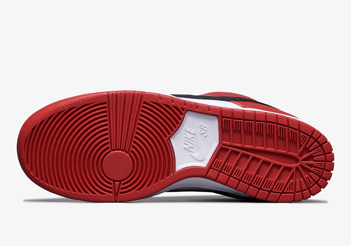 如同前述,這雙 Nike SB Dunk Low J-Pack ‘Chicago’ 移植了 Air Jordan 1 芝加哥配色,所有的細節處基本上都有致敬到位,例如白楦頭、黑 Swoosh、黑鞋帶、鞋舌紅標、紅色外底等,材質上也與 Air Jordan 1 一樣,採用了皮革鞋面。