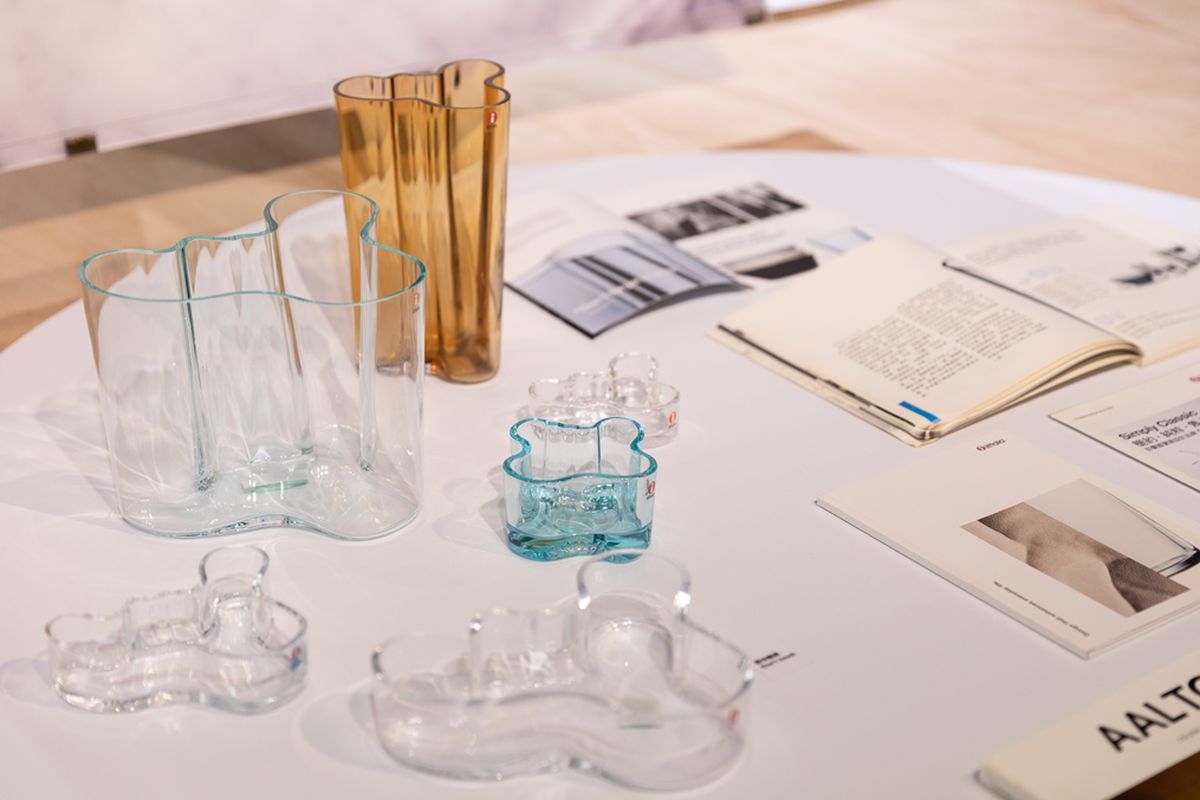 芬蘭設計必須由北歐設計之父Alvar Aalto(阿爾瓦・阿爾托 1898-1976) 、也是芬蘭現代主義建築設計之父說起。他的設計作品經久不衰,從1930年代起,至今仍受芬蘭家家戶戶喜愛,經典作品更享譽國際。其全面以使用者為中心的概念,重新詮釋現代主義。 Alvar透過人文的設計表達自然抽象本質,也帶來觸感和視覺雙重感受,更奠定芬蘭設計的方向。甫踏入展場即可看見他受全球設計迷熱愛的經典之作——1937年以芬蘭湖泊形態設計的Savoy Vase (Iittala 1881-湖泊玻璃器皿)。