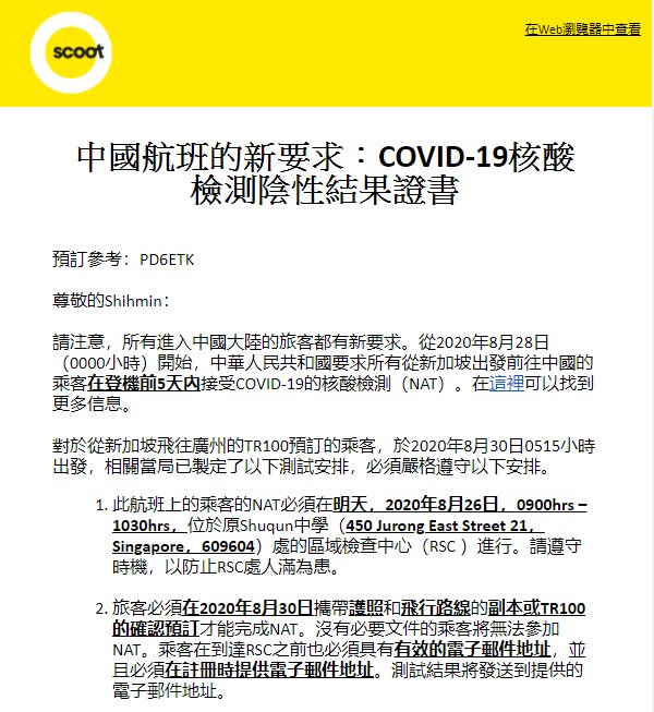 在昨日筆者的友人收到了兩封來自酷航的信件,其中不僅載有訂位代號、班機資訊,還有收件者正確的英文名字,另外寫到自 8/28 起,凡從新加坡入境中國的旅客一律均須檢附都機前 5 日內的 COVID-19 的檢測陰性結果報告,另外也提到如果是要在 8/30 搭乘 TR100 航班從新加坡飛往廣東的旅客則須在 8/26 於新加坡指定檢疫地點支付新幣 186 元完成篩檢。