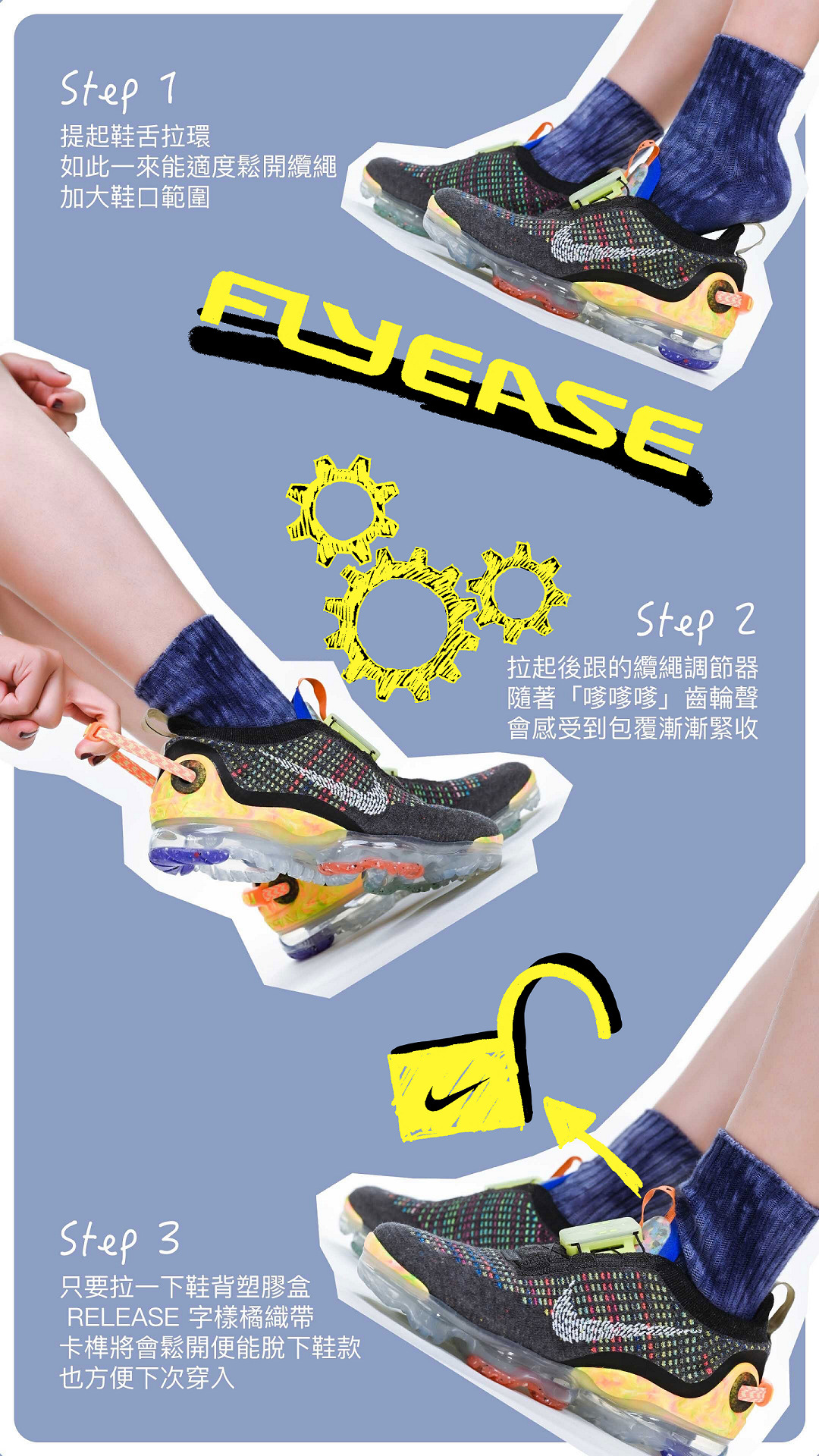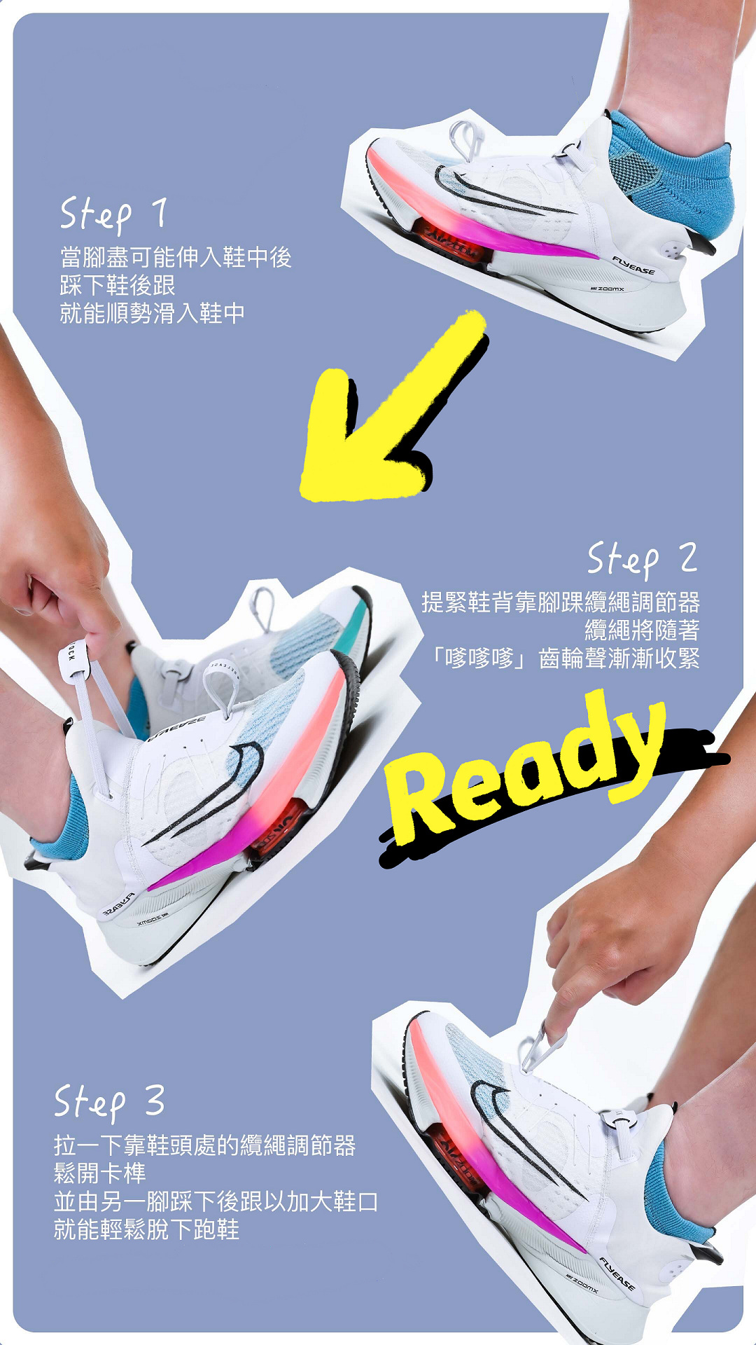 一雙鞋要完成上述條件中的兩項才足以稱為 Nike FlyEase