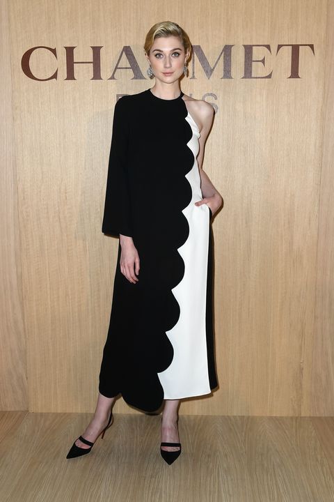 身穿一襲Valentino 2018秋冬系列的連身禮服,黑與白的垂墜面料、扇貝型的鑲邊設計以及特殊的袖口剪裁,俐落時髦,散發一股迷人的女性魅力。