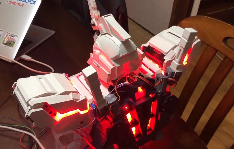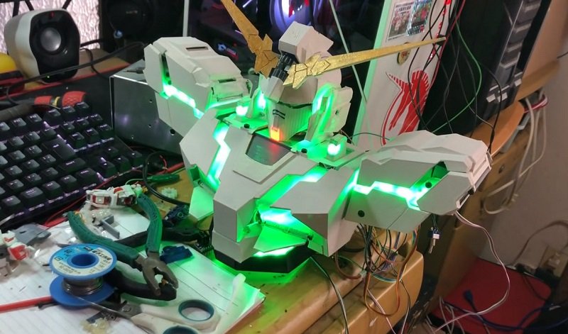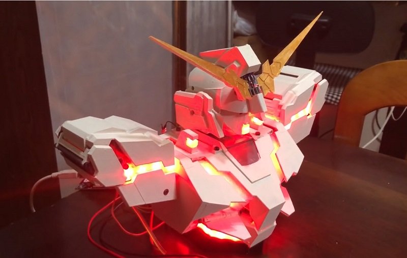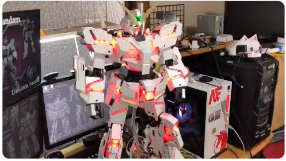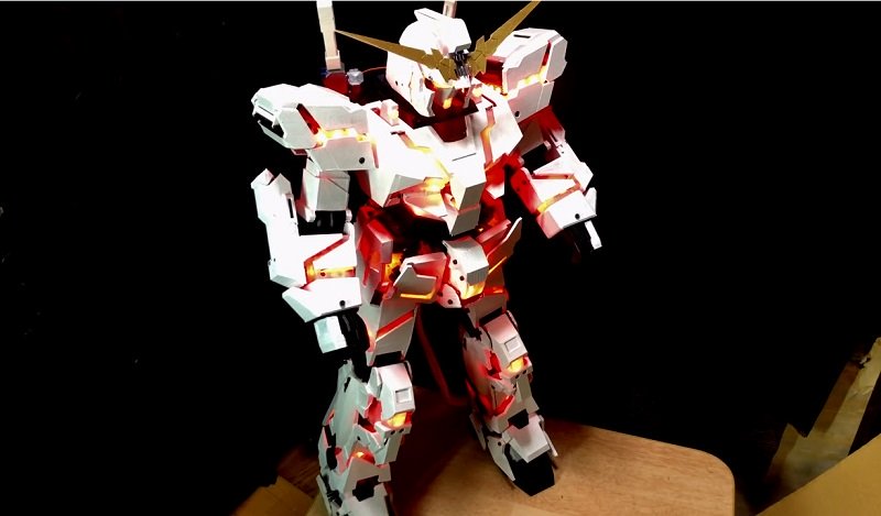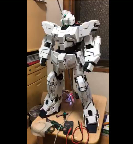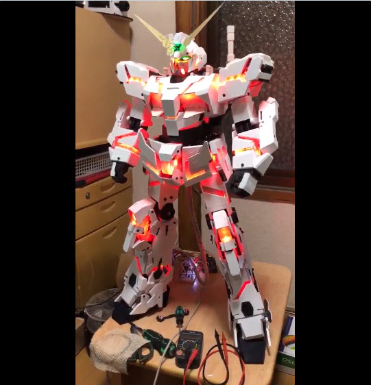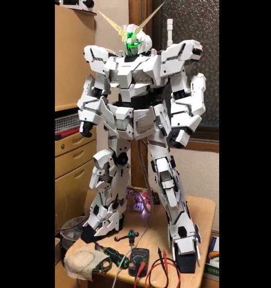 只是要做成小比例的模型又是另種挑戰難度,畢竟要在更小的身軀內建線路,且還要設定發光與變形等功能。不過對於許多鋼彈迷來說,還是希望能在家中擺上一台可以發光變形的獨角獸鋼彈,而不是相對靜止的模型,有機器人設計背景的日本達人つとむニキ就著手以1/30的比例,製作出自動變形獨角獸鋼彈,並在twitter上放上實際運作的情況;及在YouTube放上部分的製作過程。