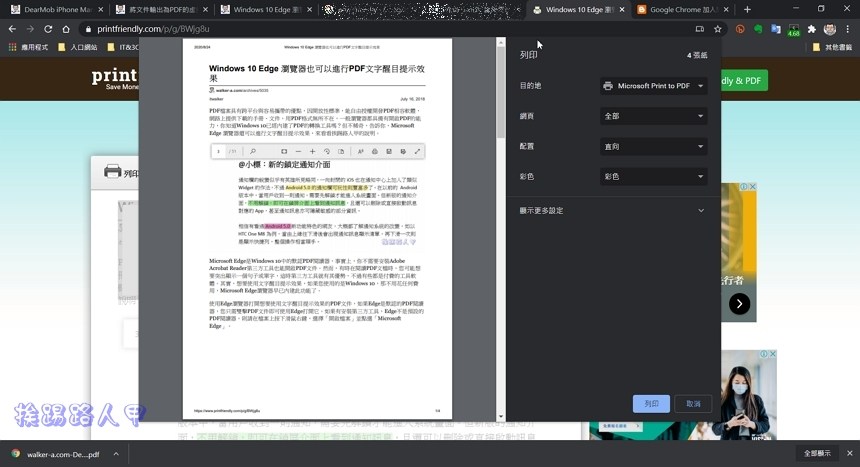 試著使用挨踢路人甲上的一篇「Windows 10 Edge 瀏覽器也可以進行PDF文字醒目提示效果」文章,透過雲端解析後,可以看到預覽上有個工作列(紅色框),預覽內容是最佳化的畫面,標題、網址與內容都會保留下來,但側邊欄、留言板與廣告都已清除,