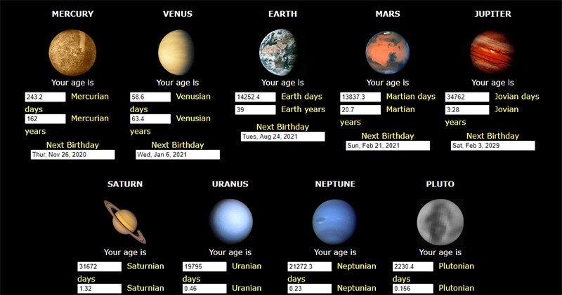 在這個年齡計算網站上面,你只需要在上面的空白欄位中輸入你的西元出生年月日,下面就會自動計算出你在各星球上的年齡、日齡,以及下一次在該星球上過生日的日子。依照下面筆者所輸入的資訊,你可以看到在火星我的年齡是 20.7 歲,從出生日現在已經過了 13837.3 日,下一次火星生日會落在 2021 年 2 月 21 。