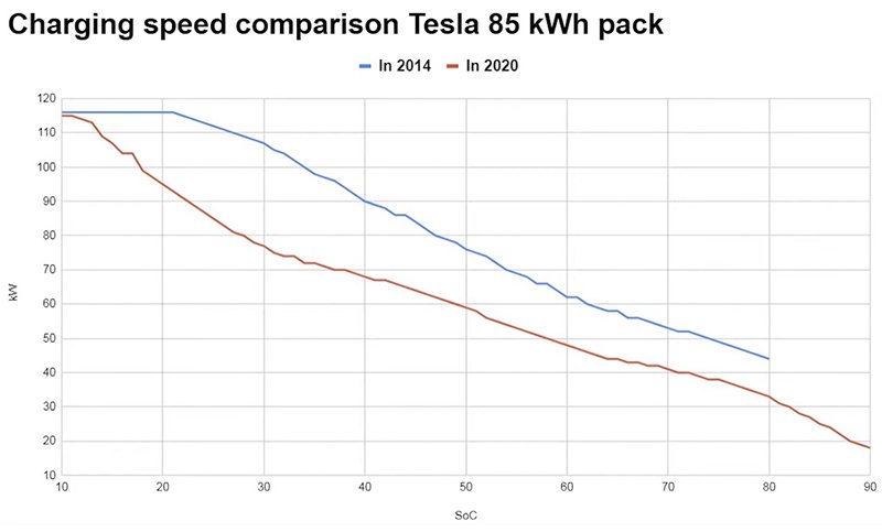 相信早期接納 Tesla 電動車的老車主,也知道電池等各方面配備幾年來的確有若干的更新,所以不會硬去爭著要官方給予更好的充電性能,但怎麼也沒想到充電速度竟然會有被下修的狀況... 根據長期關注電動車相關議題的 YouTuber Bjørn Nyland 最近所貼出的影片,他對比了 2014 年新車時的充電效率以及同部 Tesla Model S 85kWh 目前的超充效率,驗證了他近期感到充電時間變長並非錯覺。