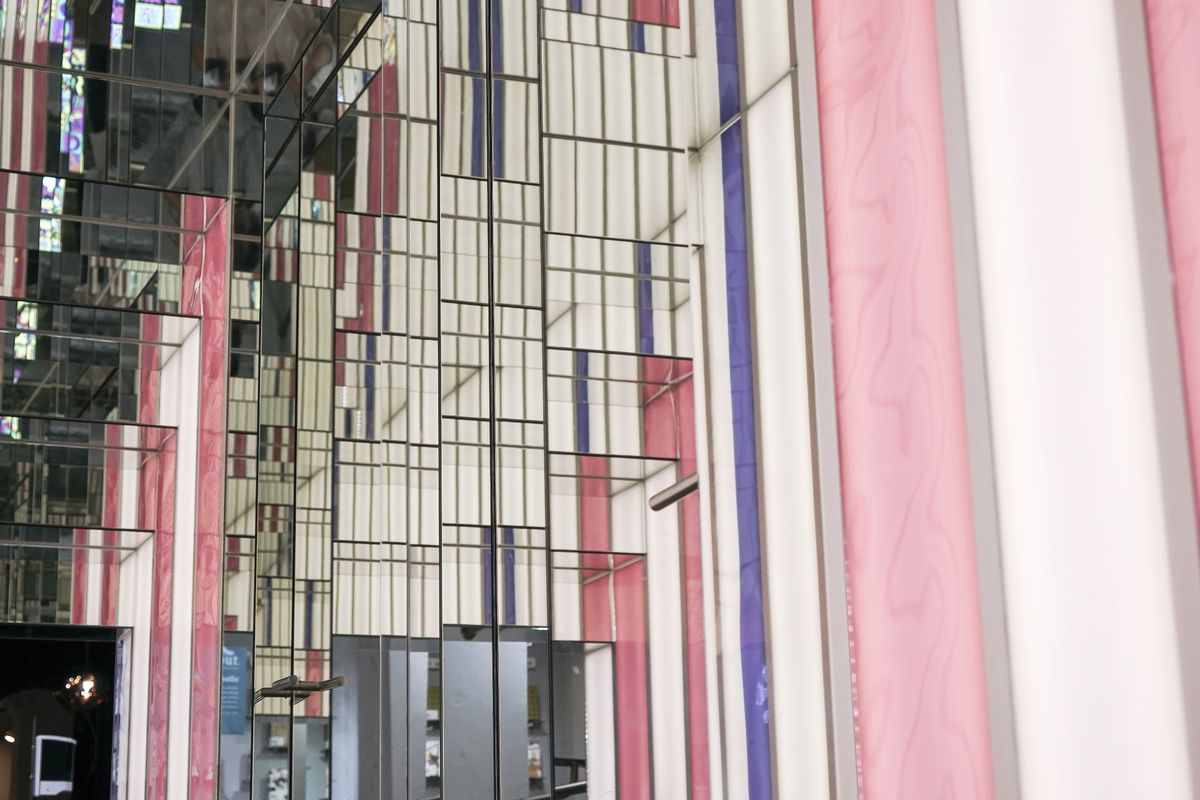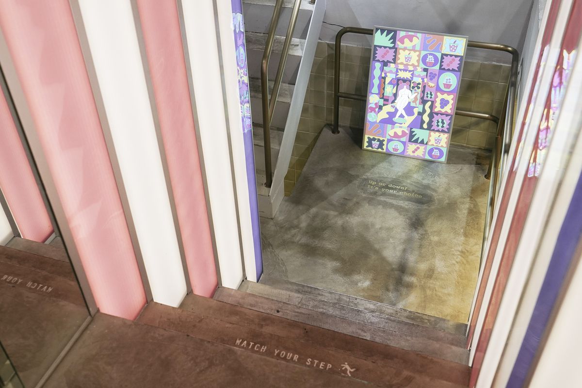 順著迷幻光廊而下,在盡頭處能看見藝術家周依的畫作,將台灣夜市招牌意象拆解重組,遊走在傳統與創新的交界。