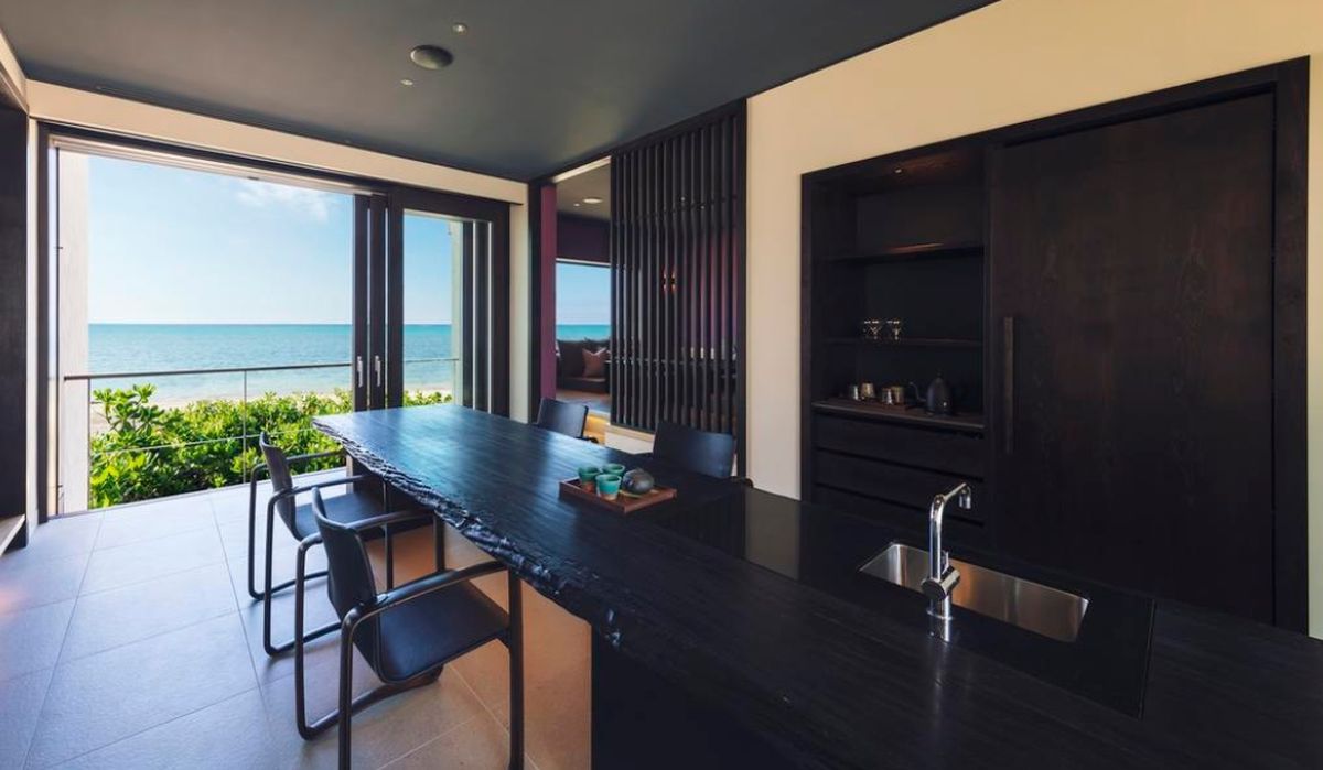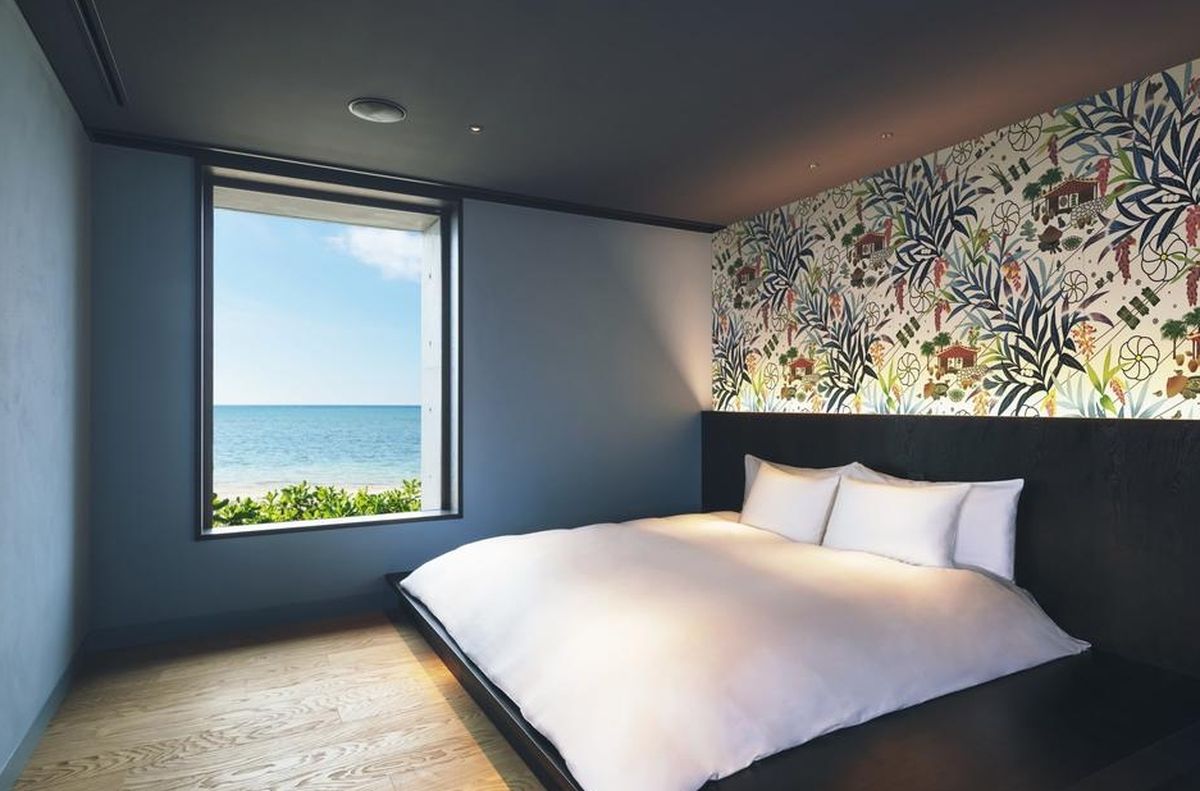 虹夕諾雅 沖繩不超過2層樓高的建築設計讓賓客近距離欣賞海岸景致,共100間的客房皆面海,寬敞的窗戶將大海氣息帶進房內,進入房間時首先會看到擺放著大餐桌的「土間餐廳(Doma Dining)」,這個銜接室內與戶外的複合用餐空間備有簡易餐櫥設備,讓住客能夠隨時享用現做美味料理。臥室牆面裝飾著琉球染織工藝製成的特殊壁紙,上面描繪有沖繩當地動植物與島民的日常生活,房客得以在此享受海天一色的絕佳美景,並充分感受沖繩島民閒適自在的生活步調。