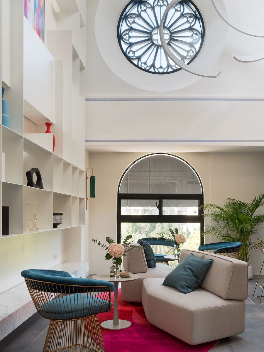 案件設計時會以「劇場式美學」為主軸,其中包含了「主題」、「場景」、「人物」、「故事」和「色彩計畫」等五大項目構成。當初承接寶台一案時,考量到辦公空間,企業也剛好面臨經營者交接,二代從英國劍橋學成歸國,實際場勘後配合業主背景判斷空間的設計彈性是可以提高的,也通過風格的轉換,間接象徵了傳承的意涵。原始建築自帶復古元素,如紅磚、拱門等,對應到軟裝上選擇了高飽和用色。而《高年級實習生》是近期蠻熱門的電影,當初和業主提案時,對方也蠻欣賞裡面所描述的自由工作環境及氛圍,以致後續溝通能如此順暢。