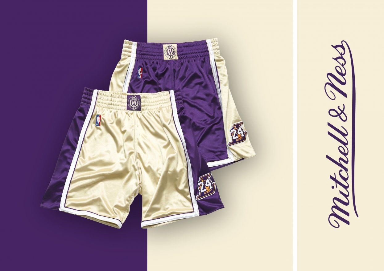 Kobe Bryant 有別於其他兩位,球衣以 Mitchell & Ness 引以為傲的球員版方式製作。配色上以更奢華的紫金色系呈現,名稱背號以精緻的雙層電繡縫上,並加入閃電紋設計元素,代表著其俐落的球風。下擺標同樣繡上球員生涯年份,以及 8、24「曼巴學院」(Mamba Sports Academy) Logo 的特殊織標,球衣布料則選用亮麗光澤的緞面材質,呈現出名人堂奢華不凡的榮耀。此為球員版球衣,定價 10,780 元、球褲定價 5,680 元。
