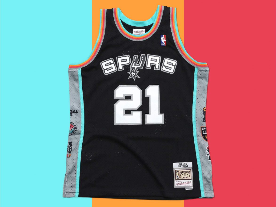 Tim Duncan 以價格較為平易近人的球迷版方式製作,但仍保持著 Mitchell & Ness 製作復古球衣的工藝技術。兩側以熱昇華的方式加入生涯的戰功偉業,領袖口則以螺旋編織的設計製作,並以馬刺 Logo 復古配色綠橘紅做點綴,領口背後壓上 Tim Duncan 生涯五座總冠軍的榮耀,下擺標則特別繡上球員生涯年份以茲紀念。此為球迷版球衣,定價 4,680 元。