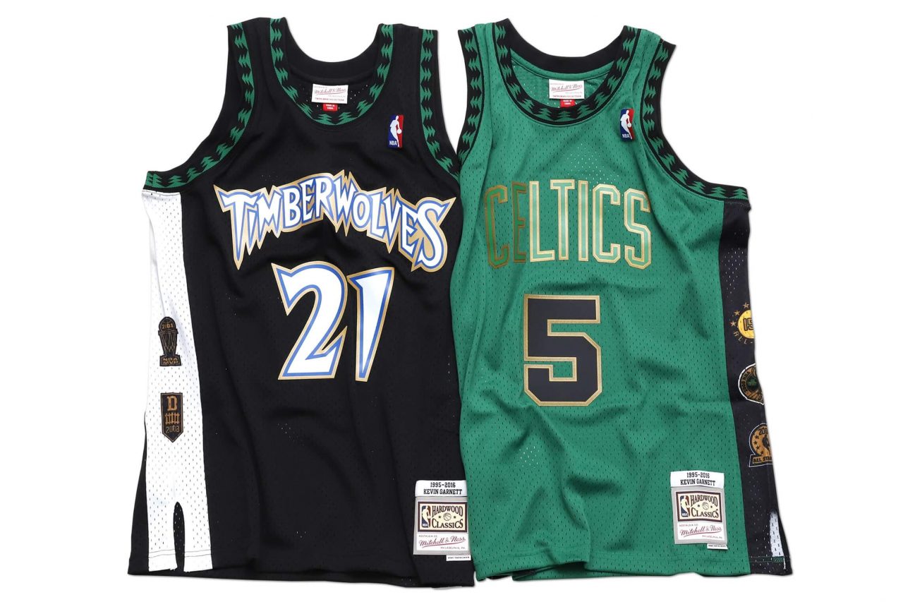 Kevin Garnett 同樣以價格親民的球迷版方式製作,並以足以代表其輝煌成就的兩支球隊做呈現。兩側同樣以熱昇華的方式呈現生涯個人的輝煌歷史,領袖口兩件同樣以黑森林紋路的螺旋編織製作,球衣的領口背後則將兩隊 Logo 互換,代表 Kevin Garnett 兩個時期對聯盟的影響力,下擺標同樣繡上球員生涯年份以茲紀念。此為球迷版球衣,定價 4,680 元。