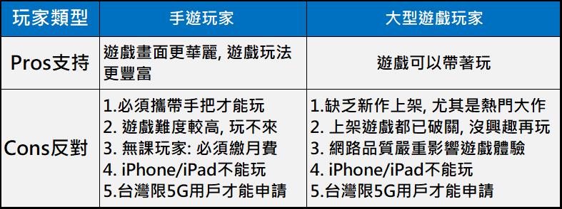 由於雲端遊戲尚在發展階段,對於台灣愛玩大型主機遊戲玩家而言,雲端遊戲雖然可以讓大型遊戲行動化,可以帶著到處玩. 但受限於雲端遊戲目前限5G用戶才能申請以及很多熱門大作並未上架,受限多但誘因小 。不過電信業者針對雲端遊戲的月費只要$149~$299, 比起隨便一張遊戲片要$1000~$2500,對於想嘗鮮大型主機遊戲的玩家而言, 省去購買高規格主機的費用,花小錢就可免費玩數十款遊戲(中華電信),仍是值得遊戲玩家去嘗鮮的高C/P值方案!