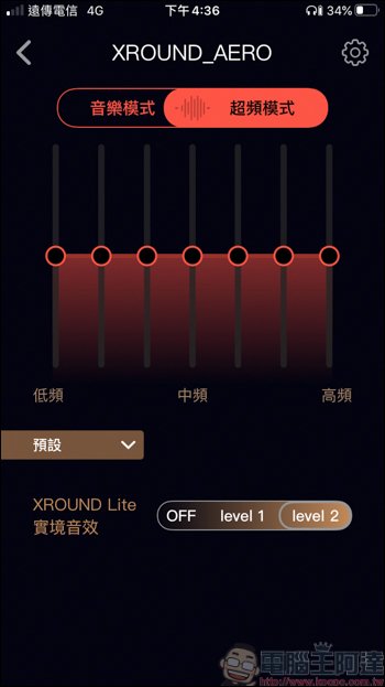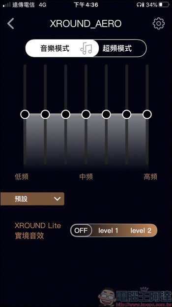進入AERO之後,你可以透過XROUND APP來控制AERO的模式,而且在XROUND APP可以控制實境音效的檔位,耳機操作只能執行開與關而已: