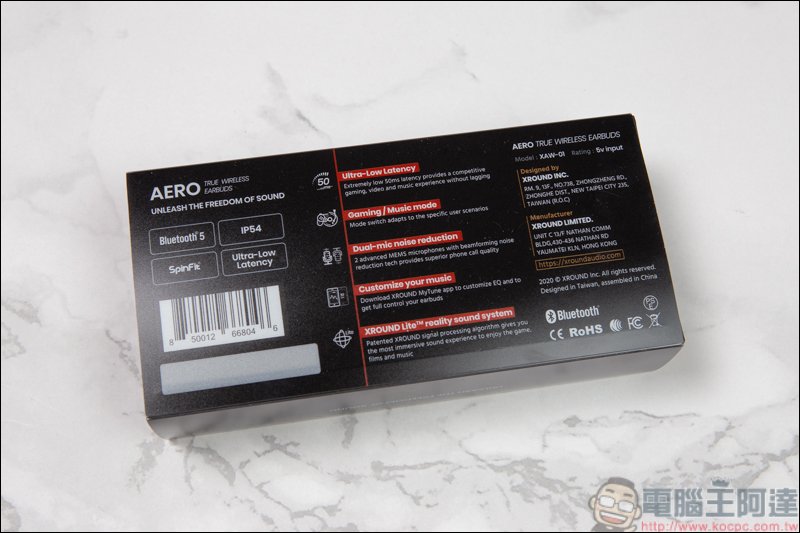 盒裝背後有本次AERO的重點:藍牙5.0、IP54防水防塵、Spinfit可撓式耳塞、超低延遲..等