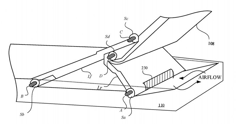 也許是看到了這方面的需求,蘋果似乎也準備要針對 MacBook / MacBook Pro 筆電產品本身下手改良,在最新被阿現的專利裡,提出了個在筆電 C 與 D 件,也就是鍵盤與底部之間加入類似鉸鏈或支架的機制,藉此透過抬起機身來提供更舒適的使用體驗並加強散熱的空氣對流。