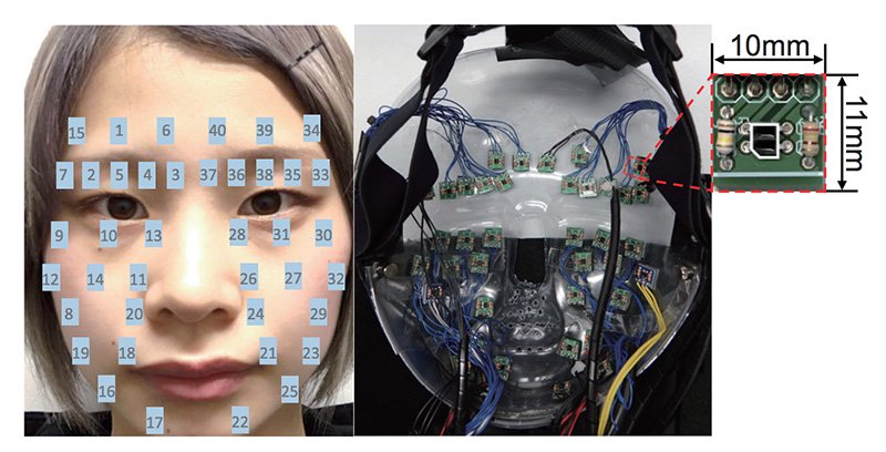 這款數位假面為了達成讓人每天佩戴的目標,整體採用輕便的設計,從頭套材質到顯示器接以輕薄為主,既能像口罩一樣防護全臉,又能傳達臉部表情。在薄型 EL 顯示器的裡面則配備有一個反射光感測器陣列,可捕捉臉部的 40 個特徵點,主要是眉毛、臉頰、眼睛與下巴,近距離地識別使用者的面部表情。利用臉部表情變化時感測器與皮膚間的距離變化,監測並學習支援 SVM 將其轉換為 10 個類型的表情。