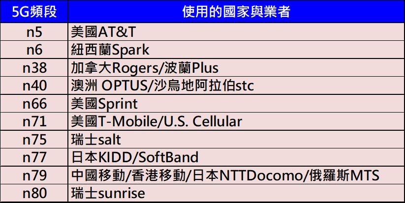 由於目前5G頻段並不統一,除了3500MHz(n78/n77)是最多電信業者採用頻段外,也有國家的5G主力頻段是採用毫米波(如美國..)或是其他5G頻段。其中,日本Softband/KIDD採用n77、美國T-Mobile使用n71、美國AT&T使用n5、中國移動(香港)/香港移動/日本NTT Docomo使用n79。