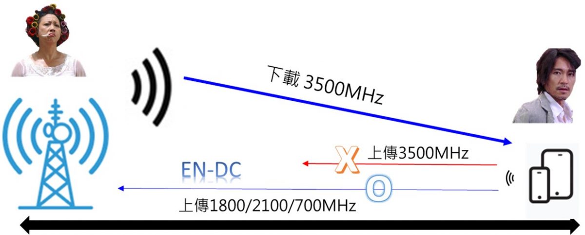 不過,在EN-DC雙連結技術下,手機可以不用採取基地台相同的頻率進行上傳。以台灣為例,台灣5G電信業者基地台普遍都可以支援EN-DC,當5G基地台以3500MHz無線電波傳遞(下載)給行動裝置後,支援EN-DC行動裝置可選擇用2100MHz(5G NSA n1)、1800MHz(5G NSA n3)、700MHz(5G NSA n28)傳遞(上傳)給基地台,不必使用3500MHz頻率回傳,將可以有效增加5G訊號有效地涵蓋距離。