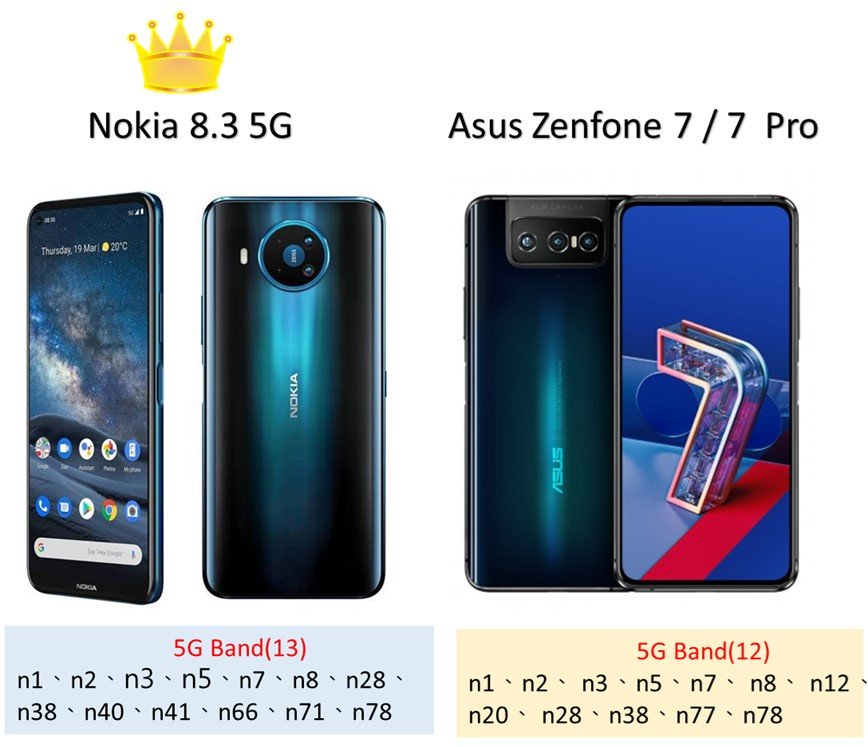 其中, Asus Zenfone 7 / 7 Pro支援5G n1、n2、 n3、n5、n7、 n8、 n12、n20、 n28、n38、n77、n78 共12個頻段,預計10月中旬將上市的Nokia 8.3 5G更是支援n1、n2、n3、n5、n7、n8、n28、n38、n40、n41、n66、n71、n78等13個5G頻段,暫時榮登台灣的"5G多頻王"寶座。若沒意外,預計10月上市的iPhone12系列應該也會支援超出10個以上的5G頻段,未來5G多頻王寶座競逐將會更激烈。