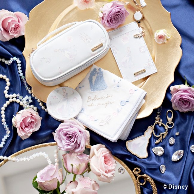 採用象徵美好戀情的粉紅色、灰姑娘禮服的天藍色以及質感海軍藍,上面裝飾仙杜瑞拉、玻璃鞋、南瓜馬車、城堡等童話元素的細緻插畫,夢幻設計仙氣爆表!「聯名手帕」上還印著王子在舞會上紳士親吻仙杜瑞拉手背的浪漫瞬間剪影(美翻),同時則在細節處用優雅的金色點綴「玻璃鞋造型吊飾」,擁有一件就能感受到仙杜瑞拉第一次踏入華麗城堡的幸福心情~