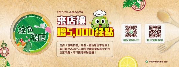 為推動「綠色消費循環」的理念,環保署推行「環保集點制度」,讓消費者不論是購買綠色商品、搭乘大眾運輸或參與環保行動,都能化為「環保綠點」獲得實質回饋。像是近期受到關注的「綠色餐廳來店禮」活動,目的是為了支持「環境友善」業者,意即提供綠色、低碳之供餐及用餐環境之餐飲業者。即日起至2020/9/30到環保集點指定的綠色餐廳合作店家消費,只要出示「綠色餐廳來店禮贈5,000綠點」的 兌換券即可獲得5,000綠點(等值50元)回饋!