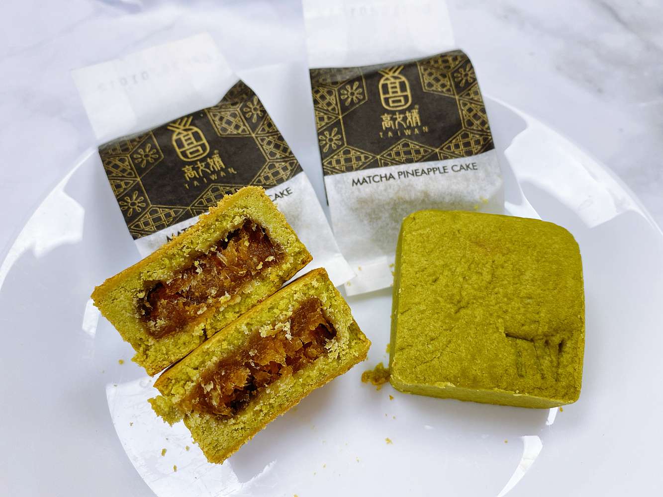 「抹茶鳳梨酥」是高女婿與日籍星級大廚白川貴久研發合作,使用日本京都宇治抹茶粉,香酥外皮包覆著紮實的金鑽鳳梨餡,微苦中帶著清甜,每口都能嚐到果肉纖維。