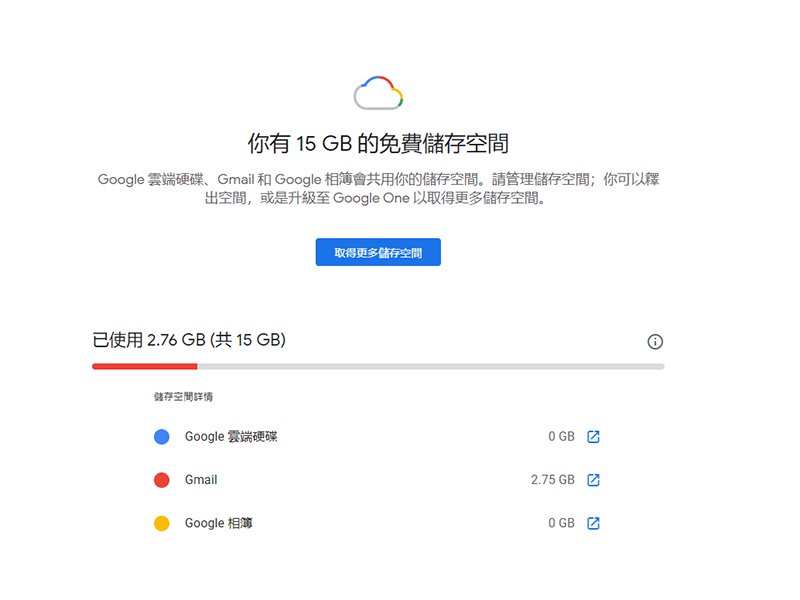 到底該怎麼釋放 Gmail 的空間呢?在釋放之前,你必須先了解目前你的空間是被哪些 Google 旗下服務所佔用,請到「one.google.com/storage」網址中,在瀏覽器裡查看每個服務所佔用的百分比。如果你是一般用戶,看到的會是下面的畫面:
