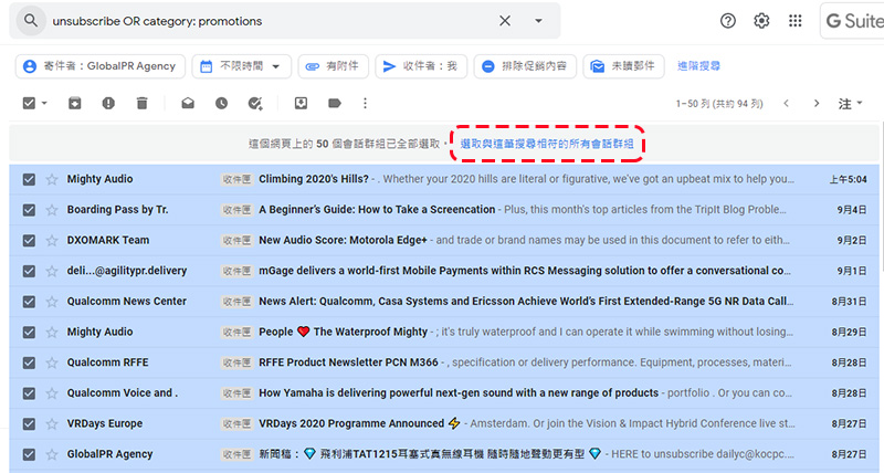 而 Gmail 在預設情況下會試著將這些信件歸類到「促銷內容」分頁中,如果想要將包含被 Gmail 認定為促銷內容的信件一併刪除,可以在搜尋欄位中輸入「unsubscribe OR category: promotions 」(針對中文信件)或「unsubscribe OR category: promotions 」(針對英文信件),篩選出來後勾選並刪除。
