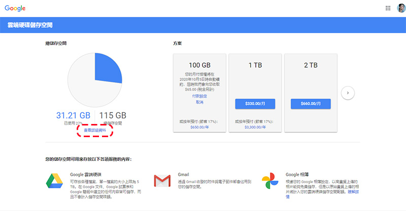 如果你是 G Suite 用戶,則會看到下面的畫面,然後點選圓餅圖下方的「查看詳細資料」來了解目前儲存空間中各服務所用掉的細項: