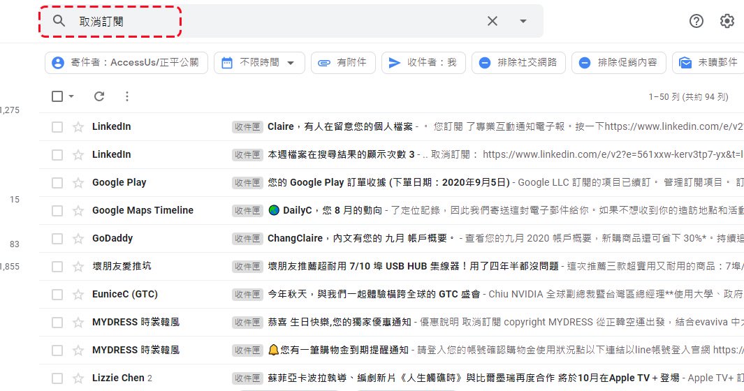 除了移除垃圾信件匣中的內容外,你的收件匣中可能會有很多來自零售商、通路或是其他無用的廣告信件,這類信件通常會帶有「取消訂閱」按鈕,你可以針對這一項來做搜尋。你可以在搜尋欄位中輸入「取消訂閱」(針對中文信件)或是「unsubscribe」(針對英文信件),過濾出這些可取消訂閱的新訊通知信,然後勾選後進行刪除。