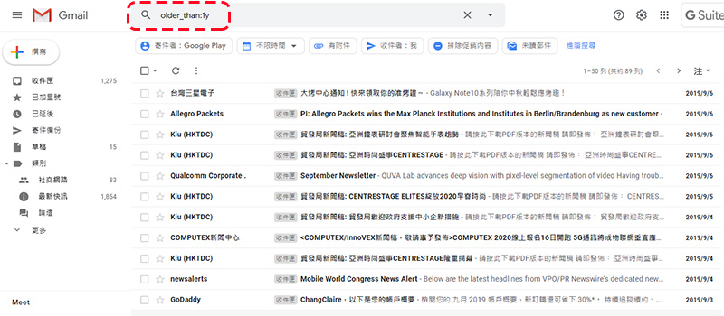 有些很舊的郵件已經失去時效性或沒有保存的價值與意義,除了手動切換到最後一頁慢慢往回刪之外,你可以有更聰明的做法。在搜尋欄位中輸入想要設定的期限,就能輕鬆過濾出符合條件的信件。舉例來說,你想要刪除 1 年以前的電子郵件,只需在搜尋欄位輸入「older_than:1y」。