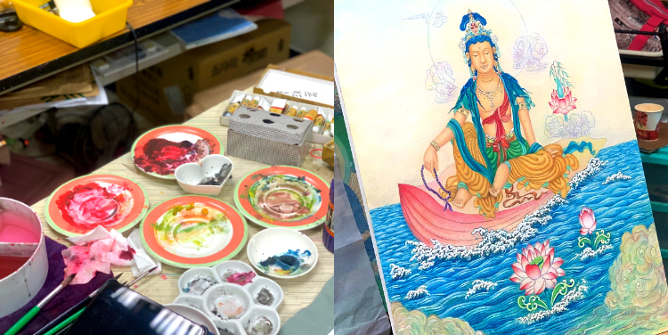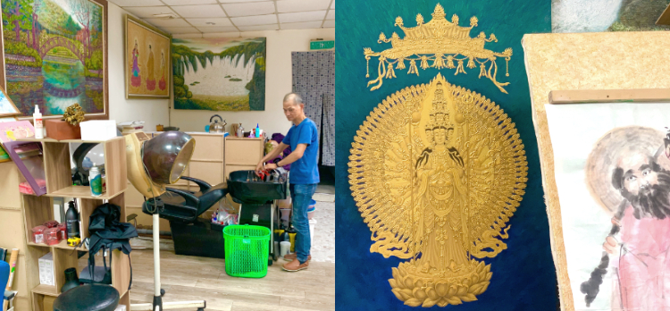 至於「斜槓阿伯」這個稱號,老闆直言:「不敢當!」一開始,只是在下班後的閒暇時間,用鉛筆素描畫一些髮型設計圖,黑白素描畫久了,慢慢開始挑戰水彩風景寫生。近幾年專心鑽研佛像畫,但因為都是趁沒客人的時候才能畫,所以每幅佛像畫的完工時間都是以年來計算,其中最久的一幅就花了老闆近3年的時間才完成,但他仍然樂在其中,這一畫也是數十年了。