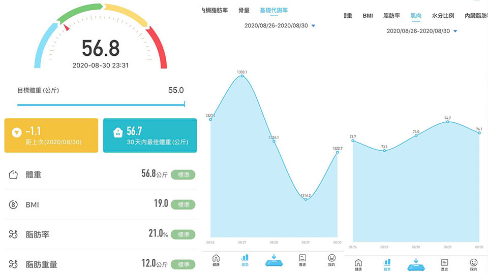 小編自己覺得iNO藍芽體重計使用起來真的超級方便,不用手動開關機,只要打開手機的藍芽功能,直接站上體重計一秒就測量完成同時傳輸數據,腳離開體重計就會自動關機非常省電。APP的介面也設計得非常易看好懂,隨時隨地想確認都OK,也不用怕自己忘記數值,每天都能聰明追蹤脂肪量和肌肉量來激勵自己達到更有感的減肥效果,想大吃的時候打開APP看一眼保證立刻會少吃一點,沒有什麼比血淋淋的數據更能讓人乖乖控制飲食了啊!