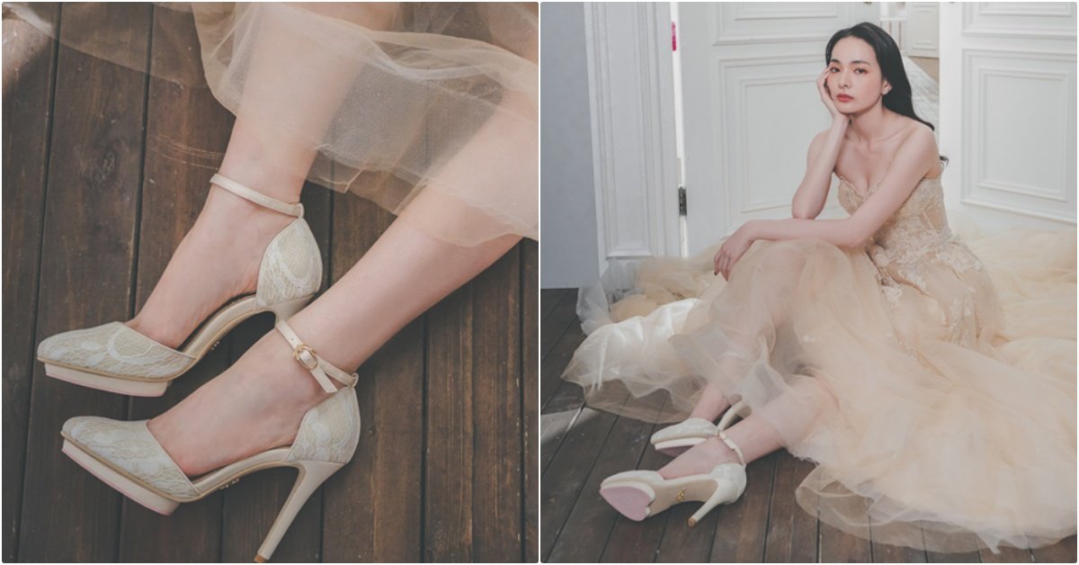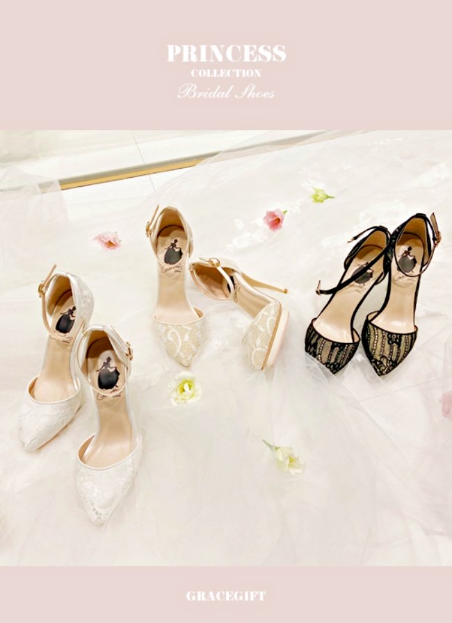 在午夜12點一到,神秘的女孩匆忙離開掉了一只玻璃鞋,王子為了尋找她,派使者挨家挨戶全國試鞋,最終找到完全吻合的命定之人…這象徵幸福的「玻璃鞋」你也能穿上出嫁(笑),Grace Gift的「仙度瑞拉婚鞋」推出兩種款式,一款以典雅的蕾絲打造而成,11CM鞋跟讓你穿上婚紗秒擁有女神比例。