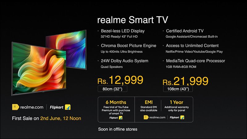 realme 智慧電視畢竟定位為入門消費市場,因此售價也相當便宜。 32 吋機型建議售價為 12,999 印度盧比(約合新台幣 5,142 元), 43 吋機型建議售價為 21,999 印度盧比(約合新台幣 8,700 元):