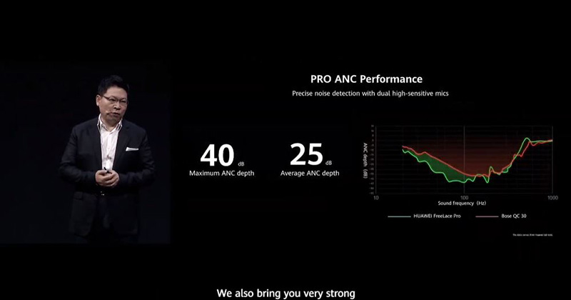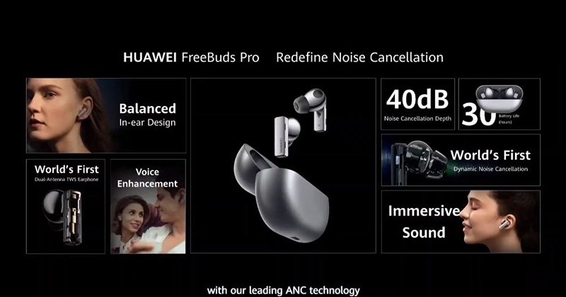 這款全新的真無線藍牙耳機承續前代的設計語言,與現有型號相比,下端部分更近似於立方型的設計,耳塞部分折曲讓舒適度更高。你可以透過觸控或滑動下端來進行控制,這部分與現行大多數真無線藍牙耳機採輕拍的方式不太相同。華為表示,FreeBuds Pro 能夠利用華為的 AI Life 應用程式智慧地測試它們在耳中的貼合度,從而幫助用戶確定應該使用哪種尺寸的矽膠耳塞。除了典型的降噪功能外,華為還指出,這是首批具有「智慧動態降噪」功能的真無線耳機,能夠自動偵測聆聽環境,判斷出最適合現場環境並在三個降噪模式之間切換,其最大降噪能力為 40dB。