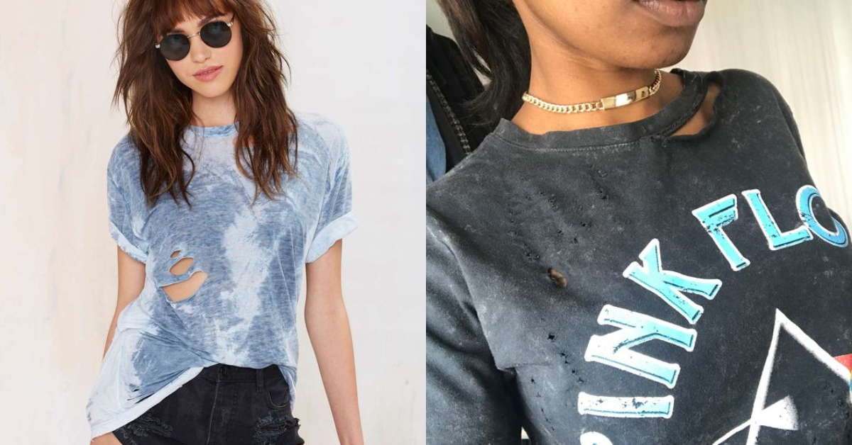 接下來這招儂編覺得很有90年代的Grunge Style!女孩們可以選擇樂團T恤,會更有風格喔~不過沒有也沒關係,因為只要使用這招,任何T恤都能瞬間變的個性感十足!在T恤上隨意選擇幾處畫上短橫線記號,剪開之後拉一拉,就能快速完成這種帶有破壞感的T恤!