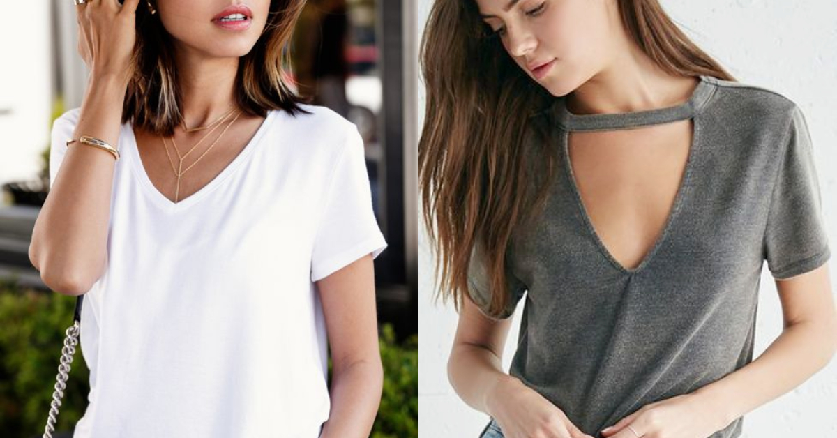 覺得圓領看久了無趣嗎?可以試試看將衣服剪成V領的,視覺上V領會比圓領更讓人有成熟的感覺!做法非常簡單,在領口處先用記號筆畫出V字,將多餘的部分剪掉,在稍微拉一拉剪過的地方,就完成啦!而V字的畫法也有很多種,除了最常看到的一般V領之外,帶點小個性的作法是不要將領為剪除,這種中空的小V字如果是大一點會是性感個性風,小一點則會給人一種俏皮感~