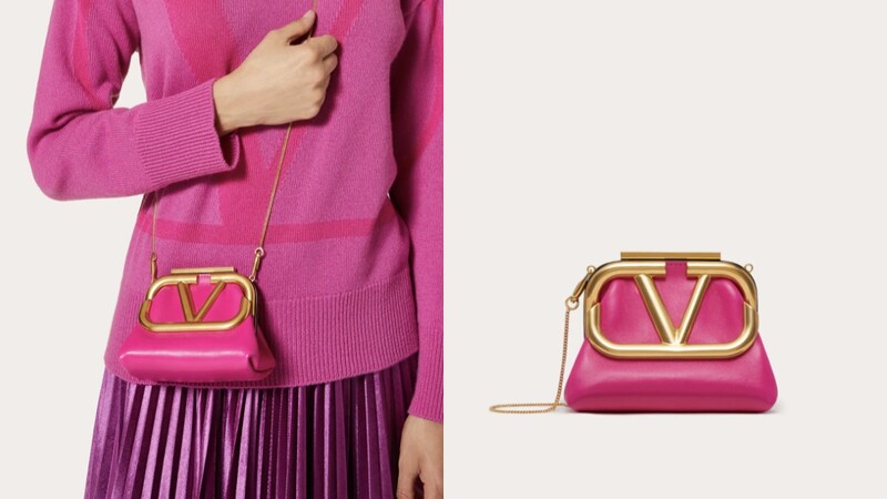 源自品牌典藏Supervee Nappa系列,Valentino Supervee Nappa包款無論在材質、造型、配色皆是品牌討論度極高的包款。2020早秋,品牌重新演繹經典,推出全新迷你口金包,不僅附加可拆式肩帶,更提供桃粉、天藍兩種配色的選擇。