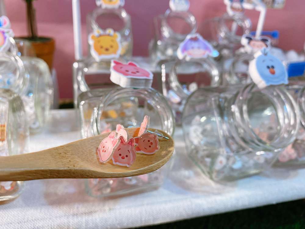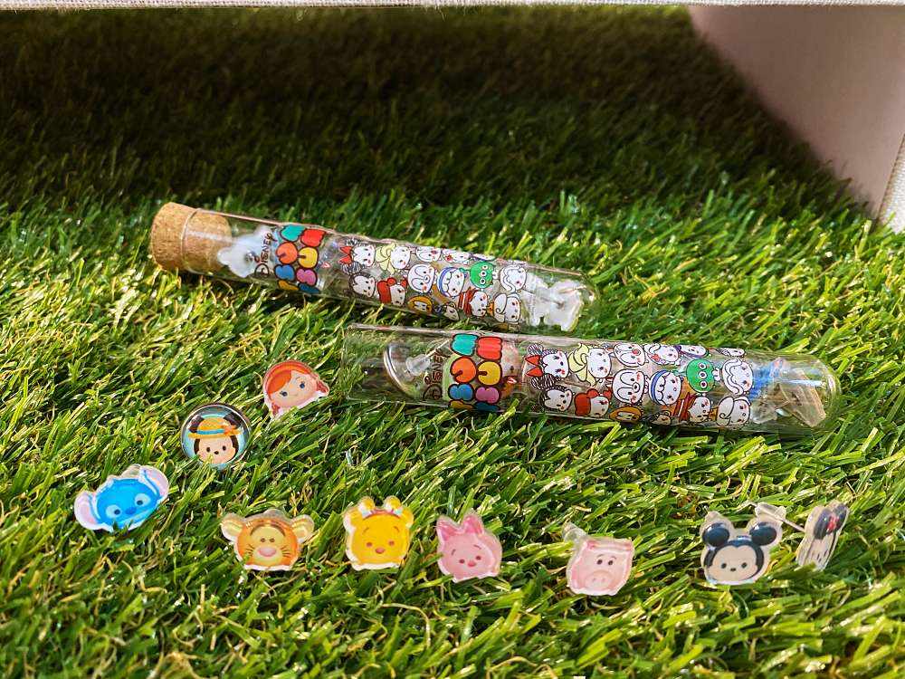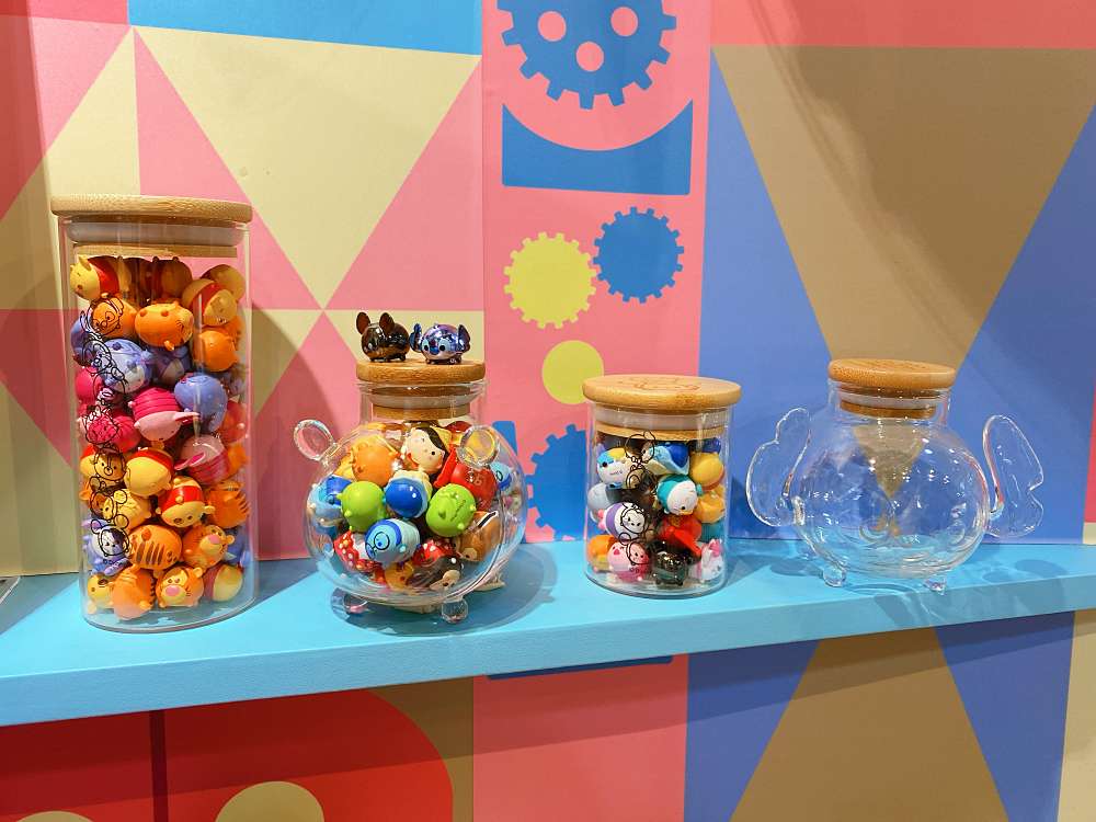 如遊樂園般的展示櫃擺放許多TSUM TSUM迷你公仔,遠遠看起來就像是糖果一樣!(笑)登場的公仔共28位角色,共有中型、小型、維尼與史迪奇造型4種玻璃瓶,其中史迪奇為台灣限定版。