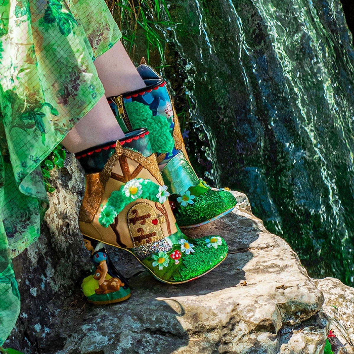 來自英國的Irregular Choice,旗下鞋款本身就是走多元素、鮮豔繁複的風格,之前推出的「迪士尼公主系列」也是每一雙都超浮誇、被網友笑到不行,例如這雙白雪公主高跟鞋,綠色的植物部分都用立體絨毛呈現,而鞋跟則和《花木蘭》聯名鞋一樣,是用白雪公主作為設計,看著白雪的頭頂著一雙腳,真的好恐怖啊XD